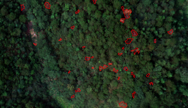 松材变色立木监测 综合利用光谱、纹理信息实现土壤、枯草等环境背景高效抑制和变色立木的高精度识别,精准提取变色立木的位置、空间分布和冠层面积等信息,为疫木治理提供数据支持。